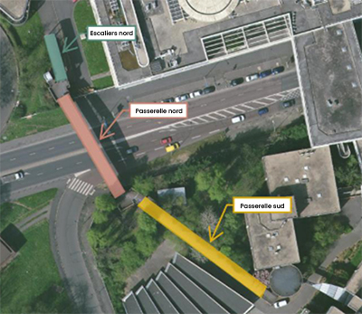 Un diagnostic et une étude de faisabilité ont été menés par le bureau d’étude AMTECH sous le pilotage de la direction du patrimoine avec pour objectif la rénovation globale de la passerelle et la pose d’une colonne ascenseur extérieure côté bâtiment L pour améliorer l’accessibilité aux personnes à mobilité réduite.